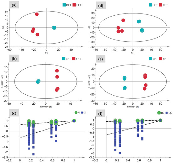 To better observe the chemical variation between BFT and FFT, OPLS-DA analysis was performed, and the score plot model was shown in Figure 2b,e. The OPLS-DA models possessed great fitting and prediction abilities, as reflected in the evaluation parameters: R2Xcum = 0.774, R2Ycum = 0.999, and Q2cum = 0.972 for ESI+ mode and R2Xcum = 0.918, R2Ycum = 0.999, and Q2cum = 0.987 for ESI– mode. In addition, a 200-times permutation test was performed to determine whether the two new OPLS-DA models experienced over-fitting. In Figure 2c,f, all the permuted R2, and Q2 values to the left were lower than the original points to the right, strongly indicating that the OPLS-DA models are valid.