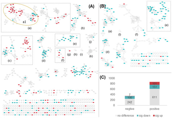 Feature-based molecular networking of chemical constituents from BFT and FFT in PI (A) and NI (B) model. The clusters marked with different lowercase letters represent the chemical classes annotated by MolNetEnhancer (steroidal saponins (a), steroidal alkaloids (a1), lineolic acids (b), amino acids, peptides, and analogs (c), 1-acyl-sn-glycero-3-phosphocholines (d), flavonoids (e), hydroxycinnamic acids (f), depsipeptides (g), aryl phosphotriesters (h), carbohydrates (i), purine nucleosides (j), 1,2-aminoalcohols (k) and fatty acids (l)). The nodes with red, green, and grey colors represent the contents of their corresponding compound between BFT and FFT are significantly up, significantly down, and have no difference (p < 0.01), respectively. The numbers of nodes with different color in negative and positive model were summarized (C).