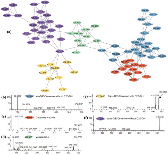 Molecular networking of steroidal alkaloids (a), The typical MS/MS spectra of cis-D/E-cevanine without C20-OH (b), cevanine N-oxide (c), veratramine (d), trans-D/E-cevanine with C20-OH (e) and trans-D/E-cevanine without C20-OH (f).