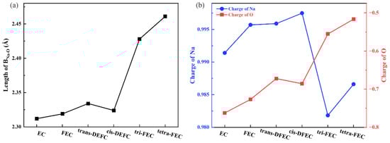 EC, as a solvent, exhibits excellent solubility for salts and is a widely used electrolyte solvent []. The structure of the system composed of EC and Na-ion was optimized by considering the solvation effect and van der Waals force. The Na bond can reduce LUMO by changing the ratio of C atomic orbital in LUMO or the composition of LUMO, which not only promotes the decomposition of electrolyte, but also makes the charge transfer between solvent molecules and Na ions. Under the action of various factors, the stability of [Na+-solutions] complex will also change; that is, it changes the solvation ability of the solvent. Thus, The Na bond is often considered as the judgement standard for solvation ability for its important interaction in SIB, such as the Li bond and the hydrogen bond in LIB [,], and it has close relationships with BNa-O, etc. The distance of Na and O in this paper is smaller than that of the average value in the [Na+-EC] solvation sheath (2.359 Å) [], which exhibits an absorption effect in Na+ and O atom, forming a BNa-O bond with a bond length of 2.312 Å. As displayed in Figure 1a, the carbonyl oxygen in the fluorinated EC molecule exhibited a considerable adsorption effect on Na-ion, but the BNa-O bond length increased with the strengthening of fluorination and reached 2.461 Å when all the H of EC were fluorinated. This length is already considerably larger than the bond length of carbonyl oxygen to Na-ion in EC. The difference between the BNa-O bond lengths of trans-DFEC and cis-DFEC is only 0.011 Å, but both lengths are larger than the BNa-O bond lengths of the EC and FEC systems. This result indicates that both configurations of DFEC exhibit similar strengths for Na-ion adsorption. However, both configurations are weaker than EC and FEC because of stronger fluorination. Furthermore, the increase in the bond length of the tri-FEC system was significant (~0.1 Å compared with that of DFEC), which is considerably larger than the increase from 0 F to 1 F and 1 F to 2 F substitution. Thus, the change in the bond length with the number of F atoms is not strictly linear. The change in the BNa-O bond length reveals that the attraction ability of FEC molecules to Na-ion gradually becomes weaker, and this trend is especially significant under 3 F and 4 F fluorination. Thus, with the weakening of the force between solvent molecules and metal ions, the solvation ability of the solvent become weaker, and the Na-ions are more likely to be extracted from the solvated sheath and embedded into the electrode, which is conducive to the progress of the reaction [].