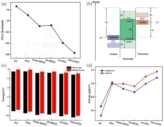 Vertical electron affinity (VEA) of EC and fluorinated EC (a). Schematic of ESW (b), ΦA and ΦC are the anode and cathode work functions, Eg is the ESW []. HOMO–LUMO of EC and fluorinated EC when Na-ion were added (c). HOMO–LUMO energy gap of EC and fluorinated EC when Na-ion were added (d).