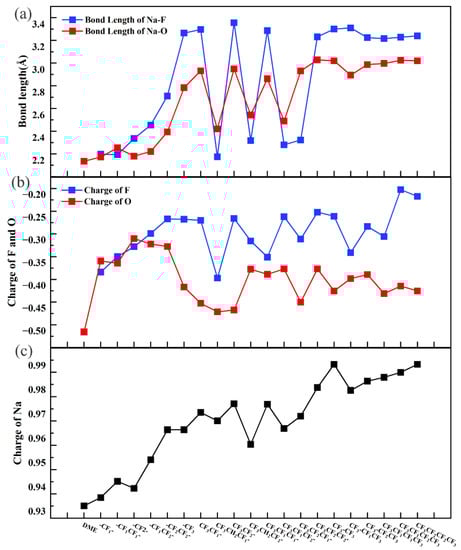 Bond length of BNa-O and BNa-F (a). Atom charge of O, F (b) and Na-ion (c).