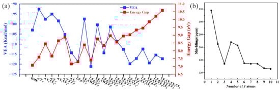 VEA and energy gap of HOMO–LUMO (a) and the relationship between absorption peaks (NMR) with F numbers (b).