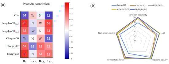 where x and y denote two random variables, i denotes the index in the regression sample, and n denotes the number of samples. In this study, we define four correlation strengths “strong”, “medium”, “weak”, and “negligible”, corresponding to the cases when the absolute values of the PC coefficients fall in the intervals (0.8, 1.0), (0.4, 0.8), (0.2, 0.4), and (0.0, 0.2), respectively (abbreviated as S, M, W, and N, respectively) to improve readability. Figure 5a displays the PC coefficients of several variables in the heat map, with the labels “nF”, “”, “”, and “” denoting the number of F atoms in each of the three units. “VEA”, “Length of BNa-O”, “length of BNa-F”, “charge of O”, “charge of F”, and “energy gap”, as signified by their literal meanings, denote variables closely related to F atoms and units. Finally, PC analysis revealed that the VEA, bond length, energy gap, and charge of F all exhibited strong correlation with the number of F atoms, among which the correlation strength of the BNa-O bond length is “S”, which is markedly stronger than that of BNa-F bond length “M”, indicating that fluorination has a stronger effect on enhancement of solvation ability than the inhibition of NaF formation. Among the three units, the modification effect of -CF3 of the aforementioned six variables is considerably greater than that of -CF1 and -CF2. As discussed in the previous section on the bond length, the amount of change in the bond length after the introduction of -CF3 is considerably greater than that of any combination of -CF1 and -CF2.