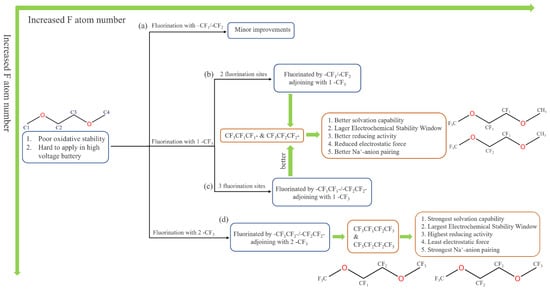 Despite these advantages, ethers exhibit poor oxidative stability and using them in high-voltage battery systems is difficult. In this study, we applied -CF1, -CF2, and -CF3 to design fluorinated DME.