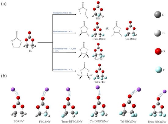 EC is a cyclic ester molecule typically used in electrolyte solvents. In this study, first, five configurations of fluorinated EC, namely EC, FEC, trans-difluoroethylene carbonates (trans-DFEC), cis-difluoroethylene carbonates (cis-DFEC), trifluoroethylene carbonate (tri-FEC), and tetrafluoroethylene carbonate (tetra-FEC) were developed as solvent molecules. Because of the symmetry of EC molecules, two configurations were obtained when fluorinated with two -CF1 to obtain DFEC: trans (two F atoms on each side) and cis (two F atoms on the same side), respectively, as illustrated in Figure 7a. Next, the RESP charge, HOMO–LUMO, and electron affinity potentials of EC and fluorinated EC were calculated. Na-ion was introduced, and the electrolyte system consisting of EC and fluorinated EC molecules with Na-ion (Figure 7b) was constructed. The properties of the six systems were investigated and the differences before and after the introduction of Na-ion were compared. All structures were optimized, and no imaginary frequencies were observed.