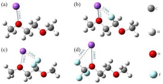 To improve the cycling performance of SIBs, three fluorinated units, -CF1, -CF2, and -CF3, of various combinations were suspended on the alkyl chain of DME. To ensure the solvated ability of Na-ion in ether solvents, we avoided directly connecting the fluorinated units to O atoms but suspended them to C atoms on the alkyl chain. Na-ion can combine with O atoms to form solvated sheaths, and fluorination decreases the charge on O and enhances the solvated ability of DME []. For DME fluorinated with one of the -CF1, -CF2, and -CF3 units alone, the structures of those fluorinated DME with Na-ion systems are displayed in Figure 8. The BNa-O, BNa-F, and BC-F bond lengths and BNa-O and BNa-F bond angles of the remaining fluorinated DME configurations are listed in Table 1. By varying the combinations of the three units, we systematically investigated the effects of the group types, numbers, positions, and the number of F atoms on the subsequent properties of DME, such as oxidative stability and solvation ability.