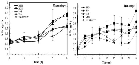 Experiments were conducted to compare the effect of growth conditions (nutrient availability) on pigment formation as well as to compare strategies for inducing carotenogenesis by means of stressing. Literature studies indicate that increased salinity and light intensity are key factors in inducing pigment formation, while the depletion of specific nutrients (nitrogen and phosphorus) can also be an important factor [25,26]. As shown in Figure 2, cell growth in the vegetative stage was observed in each of the five media tested, the highest growth being observed in BG-11 and M-8 media according to dry weight (DW) measurements. As expected, growth during the subsequent carotenogenesis stage was significantly lower (due to nitrogen depletion of the cells) although the BG-11 and M-8 media again provided the highest growth.