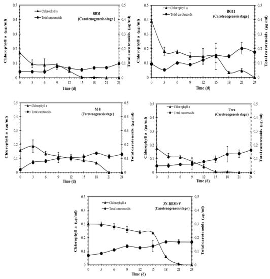As shown in Figure 3 and Figure 4, chlorophyll a and carotenoids production in the both vegetative and carotenogenesis stages was observed for all of the cultures. The highest total carotenoid concentrations, expressed in µg/mL, were observed in the BG-11 and BBM media in the vegetative stage (Figure 3). During carotenogenesis (Figure 4) total carotenoid concentrations increased in all of the media, while chlorophyll a declined to zero by day 24 in all cases. The highest carotenoid concentrations in this stage were observed for Coelastrella sp. cultured in BG-11, 3N-BBM+V and urea media.