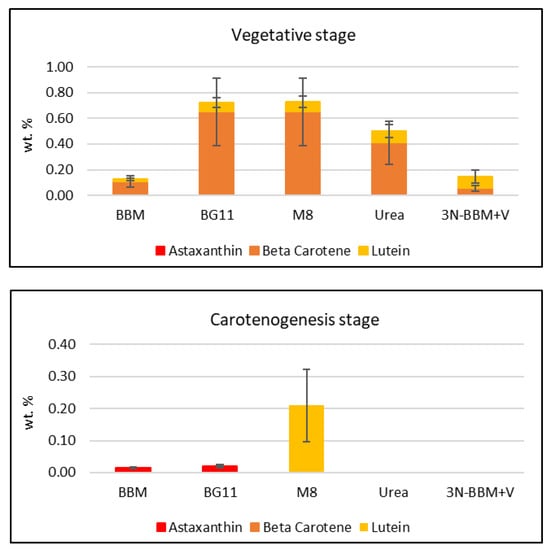 Detailed analysis of the carotenoids formed in these experiments was performed using HPLC (see Figure S3 for a representative chromatogram). HPLC carotenoid standards selected for the analysis were astaxanthin, β-carotene and lutein, as they currently hold the highest market value [1]. As shown in Figure 6, the total amount of these three carotenoids produced in the vegetative phase of the initial media screening experiments (Section 2.2) was observed to be highest in the groups cultured in BG-11 and M-8 media, broadly following the trend established for total carotenoids by spectrophotometry (Figure 3). Total carotenoids produced in the subsequent carotenogenesis stage of the media screening were much lower overall, with the highest observed being produced in the M-8 medium. Previous studies [26] have shown that primary carotenoids, such as lutein, degrade under stress conditions and therefore their concentration is decreased.