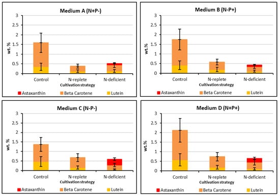 Figure 7 summarizes the carotenoid concentrations from the four BG-11 modified media combinations of N/P concentrations, the results being further sub-categorized by the three different cultivation strategies used during carotenogenesis: control, N-replete and N-deficient. Considering the control group, it is apparent that the highest β-carotene and lutein concentrations were accumulated under N- and P-replete conditions (Medium D). Conversely, the lowest β-carotene and lutein concentrations were obtained under N- and P-deficient conditions (Medium C). As for the initial media screening experiments (Figure 6), these results suggest that β-carotene and lutein accumulation are favored under conditions that are optimal for cell growth, consistent with their role in photosynthesis [4]. In contrast, the results in Figure 7 clearly show that astaxanthin accumulation in Coelastrella sp. requires high stress conditions, and specifically, nitrogen deficiency. Moreover, the requirement for nitrogen deficiency combined with high light intensity and/or NaCl addition is indicated, given that astaxanthin was not produced in the control experiment performed under N-deficient conditions (Medium C). It is also noteworthy that the highest astaxanthin concentration was accumulated when the organism was first cultured under N-deficient conditions in the vegetative phase; this would result in the lowest intracellular N concentrations at the start of the carotenogenesis phase of the experiments depicted in Figure 6, and hence, the most severe nitrogen deficiency condition.