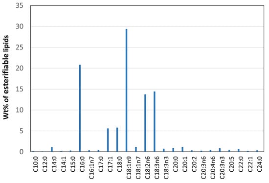 The composition of Coelastrella sp. that was cultivated using urea media (vegetative state) was analyzed and found to correspond to 24.5% total lipids, 14.7% protein, 50.5% carbohydrate and 10.3% other constituents. The esterifiable lipid profile was determined by means of simultaneous in situ transesterification and fatty acid methyl ester (FAME) extraction [31] (Figure 8), esterifiable lipids constituting 17.2 ± 0.5% of the biomass by weight. Analysis of the FAME composition showed the presence of twenty-five identified fatty acid chains, the FAMEs mostly containing saturated (SFAs, ~30.7%) and unsaturated (USFAs, ~69.3%) fatty acid chains with chain lengths from C10 to C24. The predominant component was oleic (C18:1, 29.4 ± 1.3%) followed in descending order by palmitic (C16:0, 20.8 ± 0.8%), γ-linolenic (C18:3, 14.5 ± 0.6%), linoleic (C18:2, 13.7 ± 0.6%), stearic (C18:0, 5.8 ± 0.3%) and margaric (C17:1, 5.6 ± 0.1%). The percentage of other fatty acid chains was relatively low.