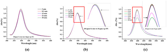 A typical color change variation with time, for 10 ppm Ag NPs + 100 ppm Cu2+, is shown in Figure S1, in the Supplementary Materials, where it can be seen that the color changes from yellow to almost colorless as a function of time. Note that the color decreases with the increasing Cu2+ concentration.