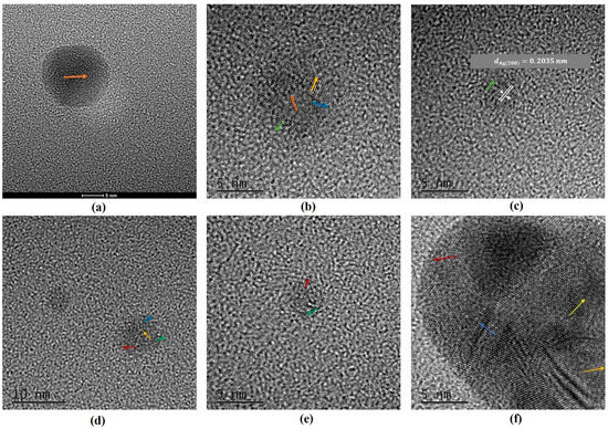 High-resolution TEM of small AgCu NPs from 10 ppm Ag NPs + 100 ppm Cu2+ at different times: (a) 0 min, (b,c) 10 min, (d) 120 min, (e) 19 h, and (f) 9 days. The arrows show local lattice orientation with Cu or Ag crystallinity in NPs.