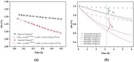 Cu adsorption on the Ag NP surface is generally considered to fit the pseudo-first-order (PFO) Lagergren equation or the pseudo-second-order (PSO) equation with nonlinear formation [51,52,53]. The pseudo-first-order kinetic equation is