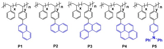 This paper deals with a further extension of the research focused on the design of novel fluorophores for chemosensors. Herein, we report the synthesis of new random copolymers of styrene with pendant fluorophore moieties, such as pyrene, naphthalene, phenanthrene, and triphenylamine (Figure 1), and the systematic investigation of their photophysical properties and application as fluorescent sensors for nitroaromatic explosives.