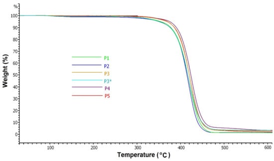 The thermal stability of the synthesized copolymers was investigated by thermogravimetric analysis (TGA) under argon flow. The Td for all synthesized polymers proved to be higher than 385 °C (Figure 2, Table 2). These data show the good thermal stability of the obtained polymers for applications as sensor materials. According to the shape of the thermogravimetric curves, it is most likely that the thermal decomposition of all the copolymers P1–P5 proceeded along the path of polymer depolymerization, similarly to styrene.