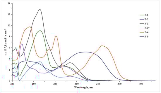 The UV–vis spectra of polymers P1–P5 contained maximum absorption bands at 350–270 nm (ε = 132,600–858,800 M−1·cm−1), corresponding to the absorption to 4-arylphenyl substituents. An intensive band at 260–240 nm (332,700–1,318,300 M−1·cm−1) could be attributed to the absorption of the phenyl ring in polystyrene [29]. The long-wavelength absorption maximum was a bathochromic shift in the series P1 ≈ P2 < P3 < P5, P4 due to the increasing conjunction of the aromatic system.