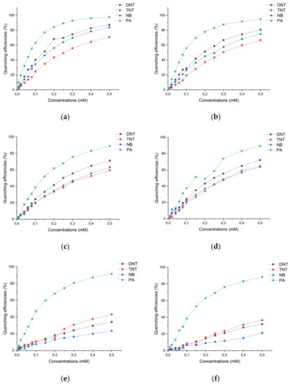 Quenching efficiencies of NB, DNT, TNT, and PA relative to fluorophores P1 (a), P2 (b), P3 (c), P3* (d), P4 (e), and P5 (f) at mM level.