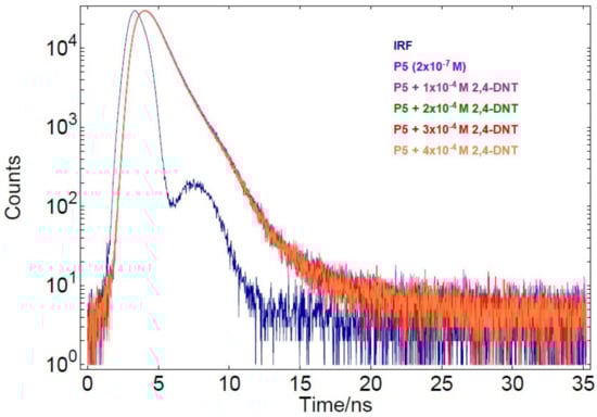 The linear relationship of the Stern–Volmer plots (in the range of concentrations from 0 to 1 × 10−4 M) (Figures S49–S54) and the lifetime measurements for P5 upon the addition of DNT suggested the predominant role of static interactions in the fluorescence quenching (Figure 7 and Figures S55–S58 and Table S4 in Supplementary Materials). To confirm this suggestion, the quenching rate constant (kq) value was calculated using the Stern–Volmer equation: