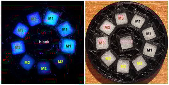For the detection of vapors, the cartridge was put into an original fluorescent recorder (Figure 11). The main design idea of this portable fluorescence recorder was the use of a compact camera for the parallel recording of the fluorescence intensities of sensing materials in the visible band (Figure S60). A UV-light-emitting diode (λem = 365 nm) was applied for the fluorescence excitation of materials on the cartridge (Figure S61). The camera was fitted with a UV-suppressing optical filter to prevent the interference of the excitation light in the fluorescence recording. During the measurement, the video stream was transmitted for processing to the PC. Custom software was used to operate the device and extract fluorescence intensity data from the video stream.