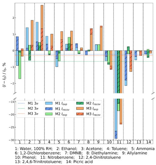 To study the selectivity of the sensors M1–M3, the fluorescence responses towards interferent vapors were evaluated (see columns 1–10 in Figure 13). Sensor materials M1–M3 demonstrated good selectivity for NB compared to the other analytes and NACs (see column 11 in Figure 13), since their quenching sensitivities were much weaker in these vapors than in NB.