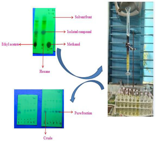 In this study, the TLC studies of the hexane–ethyl-acetate (6:4) of the hexane extract of G. wightii leaves revealed the presence of one major compound at Rf value 0.4. The compounds with Rf values of 0.01, 0.2, 0.7, and 0.8 were observed as a minor colored spot at the same solvent system. The column gradient eluted the expected product from the 10% hexane–ethyl-acetate system (Figure 1).
