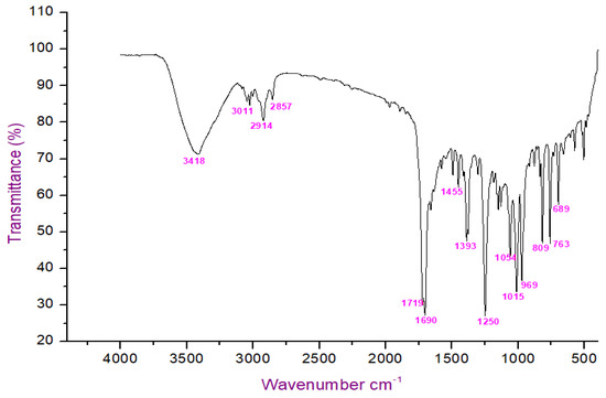 The FT-IR analysis of the isolated compounds showed absorption bands and the wavenumbers (cm−1) of the prominent peaks at 3011 cm−1 were assigned to C-H aromatic stretching. The narrow and strong characteristic peaks at 2914 cm−1 belonged to CH2 asymmetry alkane (methylene) and the narrow and weak peak at 2857 cm−1 was assigned to CH2 symmetry alkane (methylene). The observed band at 1719 cm−1 was due to the C=O stretching frequency of the lactone ring. The peaks at 1690 cm−1 and 969 cm−1 were due to the C=C stretch and =C-H bend of the olefin group. The characteristic C-O stretching frequency of the lactone ring was observed at 1250 cm−1. The remaining peaks at 1455 cm−1, which were also weak, were assigned to the methylene CH2 bending of the alkane, and the 969 cm−1 mediums belonged to the C-H bending of the olefin. The presence of C=O, C-H, C=C, C-C, and C-O bonding structures were responsible for the presence of alkyl groups, aromatic groups, methylene groups, and olefin (Figure 2 and Table 1). The LC-ESI-TOF/MS-diode-array characterization of the compound by the ionization of the intensity time exhibited a single peak range at 3.85 and the compound purity was 99.97%. The spectrum of the proposed compound molecular formula, C13H12O2, was confirmed by LC-MS, which displayed a molecular weight of m/z 201 (M + 1) (Figure 3a,b).