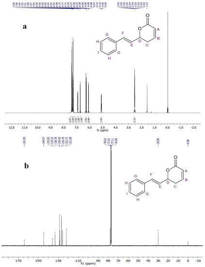 The remaining aromatic carbons’ signals resonated at δ 126.7, 128.4, 128.7, and 135.8 ppm. The 1H and 13C-NMR data analysis showed the presence of carbonyl carbons, olefinic carbons, and a cyclic ring (lactone) (Figure 4a,b). The compound was identified as the (S)-Goniothalamin derivative, (E)-6-styryl-5,6-dihydro-2H-pyran-2-one. This is the first novel compound to have been isolated from G. wightii leaves.