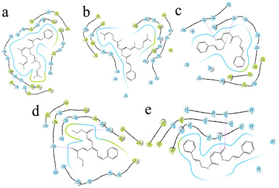 The 5 highest-ranked compounds represented with the RDRP protein of their two-dimensional interactive diagram as R1 (a), R2 (b), R3 (c), R4 (d), and R5 (e). Epoxy and carboxylic side chains exhibited the highest levels of interactivity among the top 5 structures.