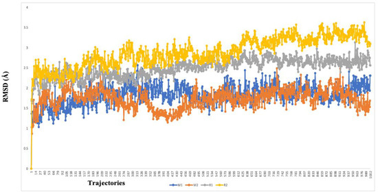 The RMSD graph of the two highest-ranked complex molecules of the main protease (M1—blue color, M2–orange color) and RDRP (R1—gray color, R2—yellow color). The deviation was below 3 Å in every instance, which suggests a higher affinity over the course of the 150-nanosecond simulation time.