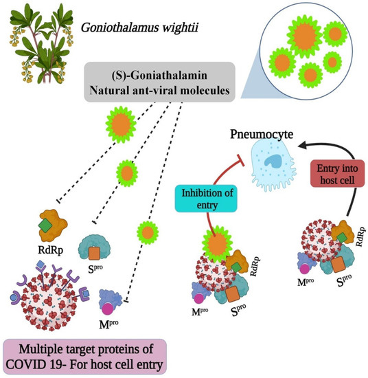 The Coronavirus 2 or novel coronavirus 2019 disease related to severe acute respiratory syndrome (SARS) has been labeled a global pandemic, resulting in millions of deaths all over the world. Originating in China during the period of December 2019 [1], SARS- CoV virus is part of the family Coronoviridae and is an enveloped single-standard RNA virus [2,3]. Its genera are further subdivided into α, β, γ, and δ [4,5]. These viruses mainly affect the respiratory, gastrointestinal, and neurological functions of humans [6,7] and attack the alveolar epithelial cells, which results in the deactivation of the respiratory tract because the virus domain attaches to the receptors of the respiratory tract, known as angiotensin-converting enzyme 2 (ACE-2) [8,9]. The ACE-2 is highly expressed in humans, and it is a recognition site of SARS-CoV-2 [10,11]. The mechanism of the amplification of the microorganisms in humans can culminate in inflammatory responses and the release of a variety of molecules from macrophages, which are indispensable to fighting the disease [12,13]. Despite remarkable efforts, no vaccines or specialized therapies for COVID infection were initially developed. Other treatment techniques are the use of nucleoside analogues, remdesivir, and ritonavir, or anti-inflammatory agents that act on COVID-19 disease for emergency purposes [14,15]. Subsequently, researchers and scientists finally determined the best way to take herbal traditional medicine to overcome the disease. Moreover, the bioactive compounds derived from medicinal plants contain antiviral, antimicrobial, and anti-inflammatory properties. It is assumed that the immunomodulatory effects of these bioactive compounds are beneficial to treating or preventing COVID-19 disease [16]. Goniothalamus wightii, the Annonaceae family, is a small tree that is traditionally used by the kanikar tribes to treat rheumatism [17]. This species-based ligand acts as an anti-SARS-CoV-2 pharmacological agent, i.e., preventing the virus’ entry and increasing immune power.