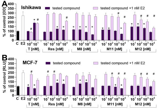 2.3. Impact on the Proliferation of Estrogen-Dependent MCF−7 and Ishikawa Cell Lines—In Vitro Study