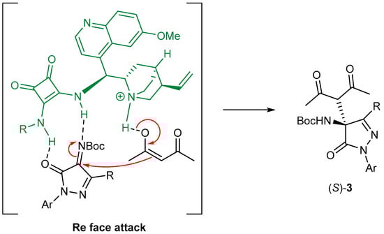 In addition, on the basis of our results and those previously reported [18,19], we proposed the formation of the ternary complex depicted in Figure 1 to rationalize the stereochemistry of the products. The H-bonding activation of N-Boc ketimine 1 by the squaramide moiety of catalyst C4 facilitates the nucleophilic attack of the diketone enolate from the re-face of the imine group, leading to the formation of adduct 3 with the (S) configuration.