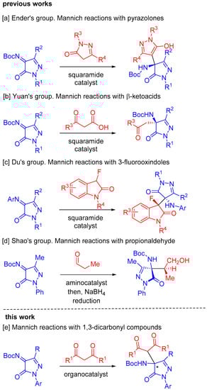The asymmetric Mannich reaction is a crucial method for the formation of new C-C bond including β-amino carbonyl compounds [17]. In 2017, Enders′ group was the first to describe the synthesis of a new series of N-Boc ketimines derived from pyrazolin-5-ones and demonstrated their use as electrophiles in asymmetric Mannich reactions with pyrazolones (Scheme 1a) [18]. The reaction proceeded smoothly with 1 mol% quinine-derived squaramide organocatalyst and the desired amino-bis-pyrazolone adducts obtained in excellent yields and stereoselectivities.