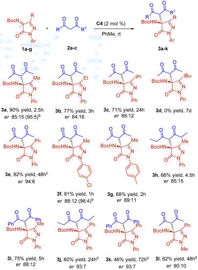 After exploring a series of pyrazolinone ketimines, the substrate scope of β-diketones was further extended. 3,5-Heptanedione (2b) readily reacted with ketimine 1a leading to 3h in good yield and moderate enantioselectivity (85:15 er), but the reaction of 1a with dibenzoylmethane (2c) giving 3i was slower and more enantioselective. Both diketones 2b and 2c reacted with the less reactive ketimine 1e in the presence of 10 mol% catalyst C4, providing adducts 3j and 3k in moderate yield but with good enantioselectivity (93:7 er).