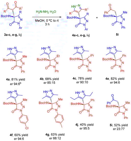 Preparation of pyrazole derivatives 4. a Reactions were carried out with H2NNH2·H2O (2 equiv) in MeOH at 0° to rt. Yields correspond to isolated compound after flash chromatography. The er values were determined by chiral HPLC analysis. b The reactions were performed with enantioenriched 3a (er 95:5) and 3f (er 96:4).