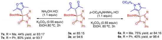 A solution of 3a,e (0.1 mmol), hydroxylamine hydrochloride (8 mg, 0.11 mmol, 1.1 equiv) and K2CO3 (8 mg, 0.055 mmol, 0.55 equiv) in ethanol (1 mL) was heated to 80 °C for 2–3 h. After that, the solvent of reaction mixture was removed under reduced pressure. The crude product was purified by flash chromatography on silica gel to afford 7a,e.