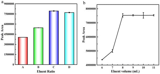 The volume of eluent was further investigated. Figure 2b indicates that the CE peak area increased with the eluent volume from 6.0 mL to 8.0 mL and then remained almost consistent at higher eluent volumes. Hence, 8.0 mL of methanol/acetic acid (90:10, v/v) was selected as the optimal eluent volume.