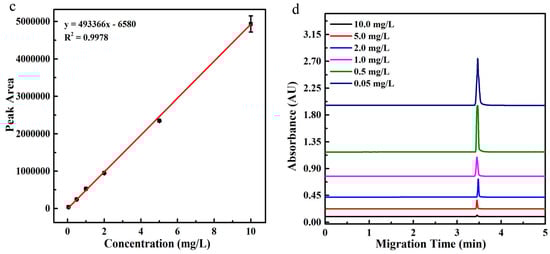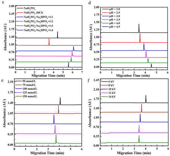 The effect of the pH (2.0–4.5) of the running buffer (100 mmol/L) at 10 kV applied voltage on the separation of 1.0 mg/L histamine was next studied. As shown in Figure 2d, the resolution of histamine improved as the pH of running buffer decreased. The highest separation efficiency, largest peak area and most stable baseline were achieved when the pH was 2.5. Accordingly, the NaH2PO4 (HCl) solution at pH 2.5 was considered as the optimal running buffer for following studies.