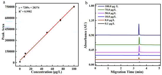 A MISPE-CE method for the detection of histamine was established in this study. As shown in Figure 3a,b, the peak area gradually increased with the concentration of the histamine standard solution from 0.1 μg/L to 100.0 μg/L. Excellent linearity was obtained between the peak area and the concentrations of histamine. The linear equation was y = 7289x + 28,374 with R2 = 0.9982. The limit of detection (LOD) (S/N = 3) was calculated to be 0.087 μg/L, and the limit of quantitation (S/N = 10) was 0.29 μg/L. Compared with the slope of the standard curve without MISPE pre-treatment (Figure 3c,d), the enrichment factor of the MISPE-CE method was 14.7.
