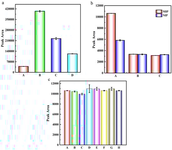 The eluent is one of the key factors during a MISPE extraction process [33]. Hence, eluent with different ratios of methanol/acetic acid (100:0, 95:5, 90:10 and 80:20, v/v) were trialed. Figure 2a shows the effect of different ratios of methanol/acetic acid on the CE peak area. The highest peak area was obtained when the ratio was 90:10. Therefore, methanol/acetic acid (90:10, v/v) was selected as the eluent for further studies.