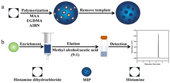 (a) Schematic illustration of the synthesis of the MIP and (b) the MISPE-CE analytical method for histamine detection.