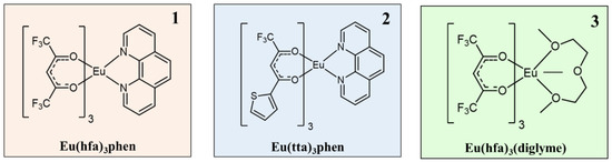 Molecular structures of (1) [Eu(hfa)3(phen)], (2) [Eu(tta)3(phen)] and (3) [Eu(hfa)3(diglyme)] complexes.