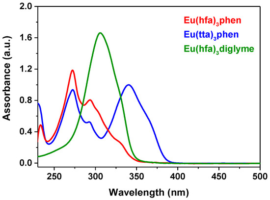 UV-vis spectra of [Eu(hfa)3(phen)], [Eu(tta)3(phen)] and [Eu(hfa)3(diglyme)], complexes from 1 × 10−4 M solutions in CH2Cl2.