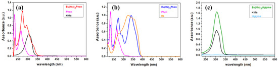 UV-vis spectra comparison of (a) [Eu(hfa)3(phen)], (b) [Eu(tta)3(phen)] and (c) [Eu(hfa)3(diglyme)] complexes with the corresponding ligands (1 × 10−4 M CH2Cl2).