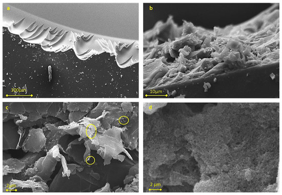 The morphology of the composite samples with 8.5% (w/w) nanofiller were observed in SEM microscopy images, depicted in Figure 1. In the cross-section of the neat polymer film (Figure 1a), a smooth surface is observed in contrast with the rough internal texture observed in the reinforced samples (Figure 1b–d), that indicates the uniform dispersion of the nanofillers by the successful high-shear mixing of the components before photo curing.