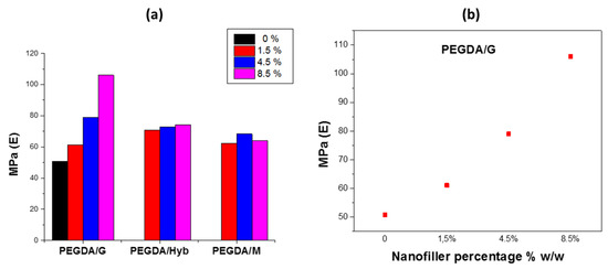 Figure 3 shows the results of the tensile study of the reinforced samples in DMA. From the tensile tests, an improvement of the Young’s modulus (E) is observed for all the reinforced specimens. More specifically, PEGDA/G samples showed the most significant increase of the Young’s modulus, which increased, furthermore, almost linearly with the graphene percentage. The Young’s modulus for the sample of 8.5% w/w of graphene showed the maximum increase, up to 108%, compared with the neat PEGDA.