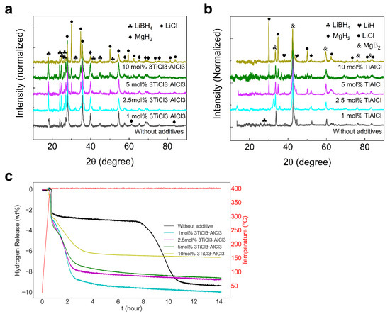 - Shao, H.; Felderhoff, M.; Weidenthaler, C. Kinetics enhancement, reaction pathway change, and mechanism clarification in LiBH4 with Ti-catalyzed nanocrystalline MgH2 composite. J. Phys. Chem. C 2015, 119, 2341–2348. [Google Scholar] [CrossRef]