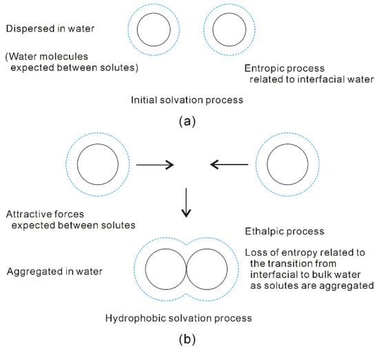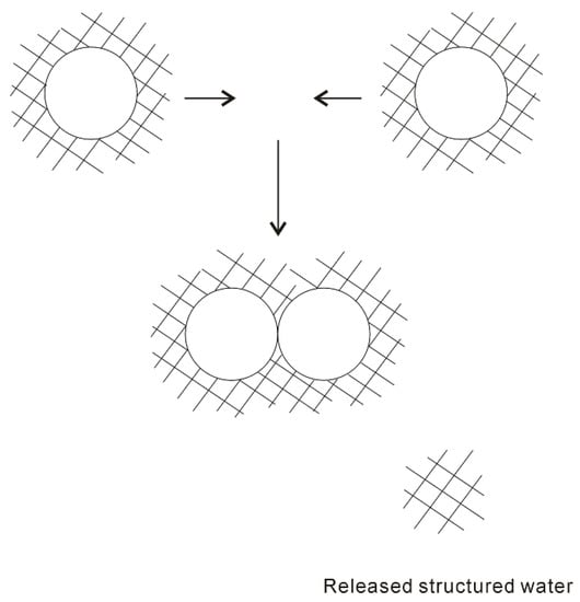 In hydrophobic solvation process, Gibbs free energy of interfacial water is higher than bulk water (ΔGSolute-water > ΔGWater-water). To be more thermodynamically stable, this may be fulfilled through maximizing |ΔGWater-water|. Indeed, this is accompanied with the minimization of Gibbs free energy of interfacial water (|ΔGSolute-water|). From the above, the ΔGSolute-water is related to the ratio of surface area to volume of solutes. It can be derived that the dissolved solutes may be aggregated in solutions in order to maximize the hydrogen bondings of water [34,36]. Therefore, the “attractive” forces may be expected between solutes in hydrophobic solvation process (Figure 8).